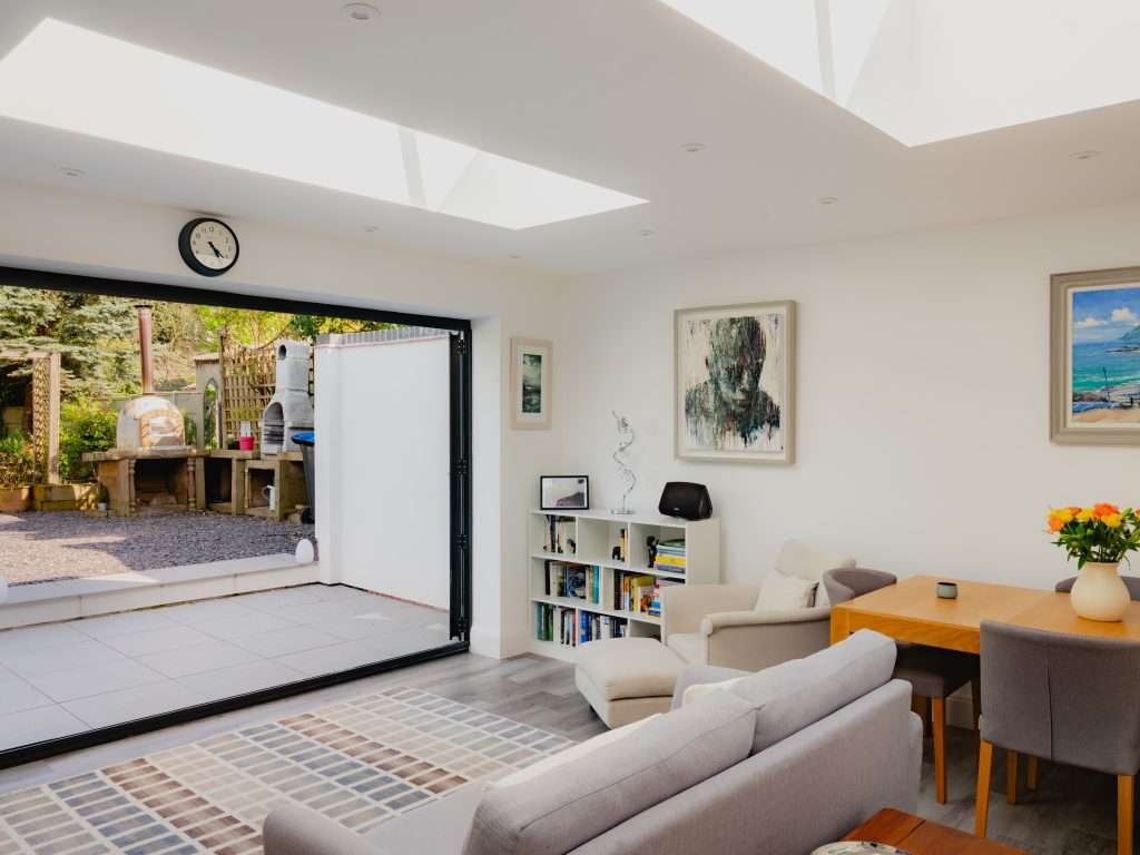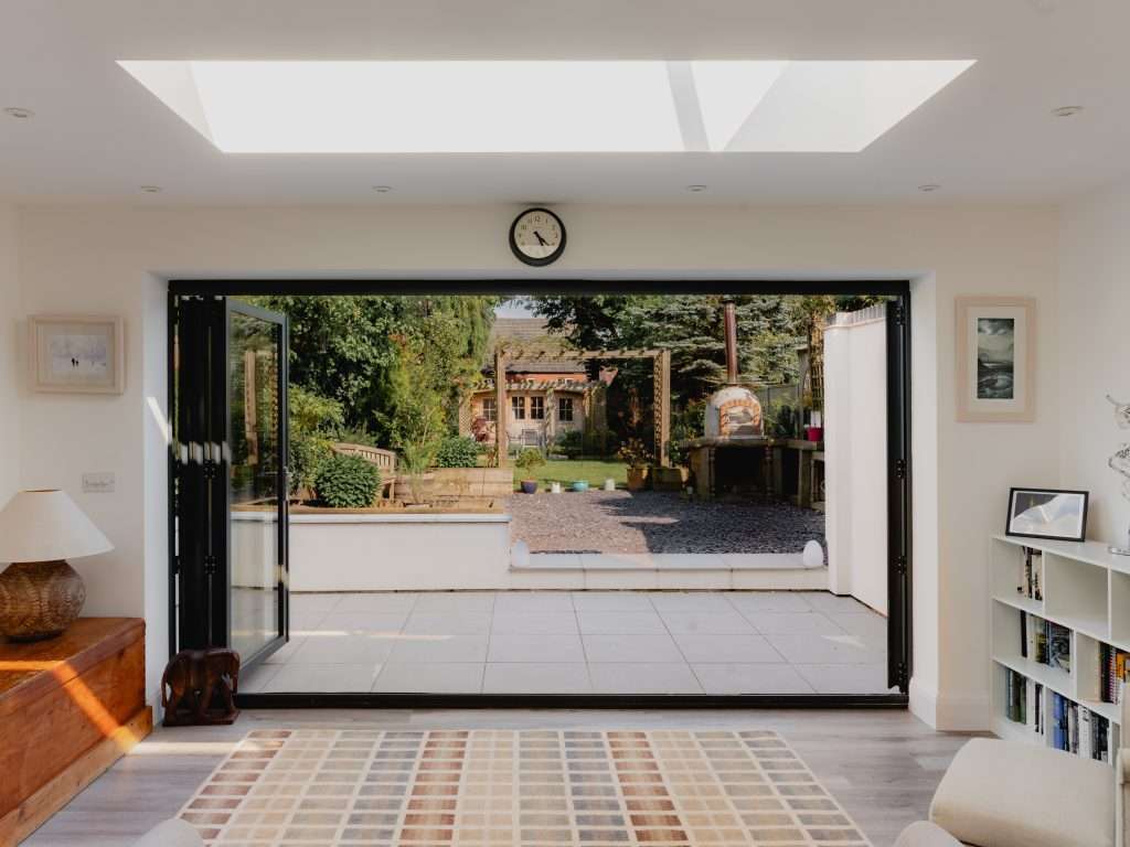 The heart of the transformation lies in the beautiful bi-fold doors, which open up fully to create a natural flow between indoors and out—perfect for summer gatherings or simply enjoying the garden views. Above, two striking roof lanterns flood the room with natural light, creating an uplifting sense of space, calm, and connection to nature.