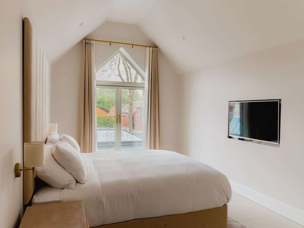 The undeniable showpiece of the renovation is the dramatic full-height gable-end glass window with a Juliette balcony, flooding the master suite with natural light. Paired with a vaulted ceiling, the space exudes openness and grandeur. Thoughtful bespoke details, like high-end shelving to display a cherished handbag collection and a clever mirrored ensuite door doubling as a wardrobe solution, showcase how design and functionality can seamlessly intertwine.